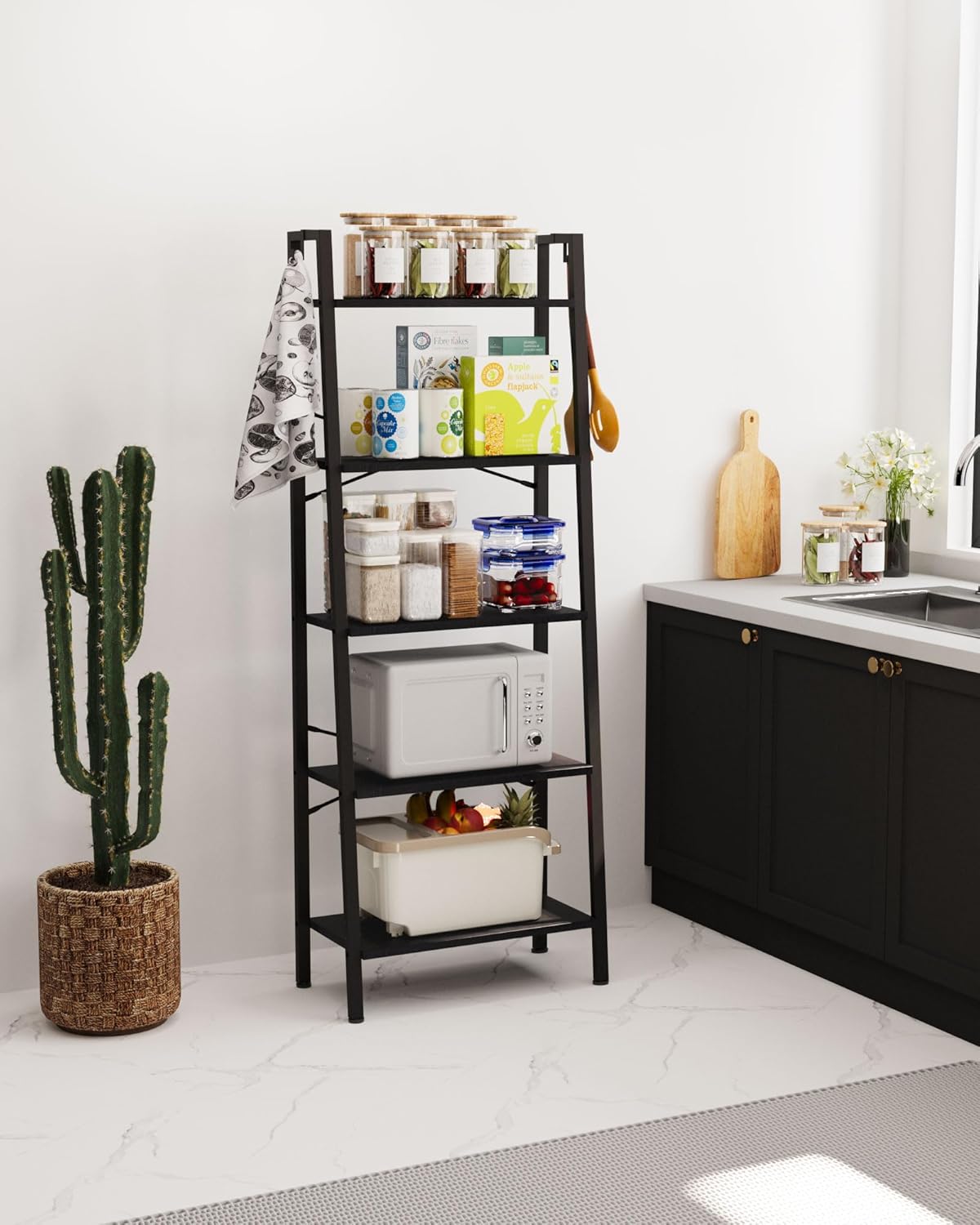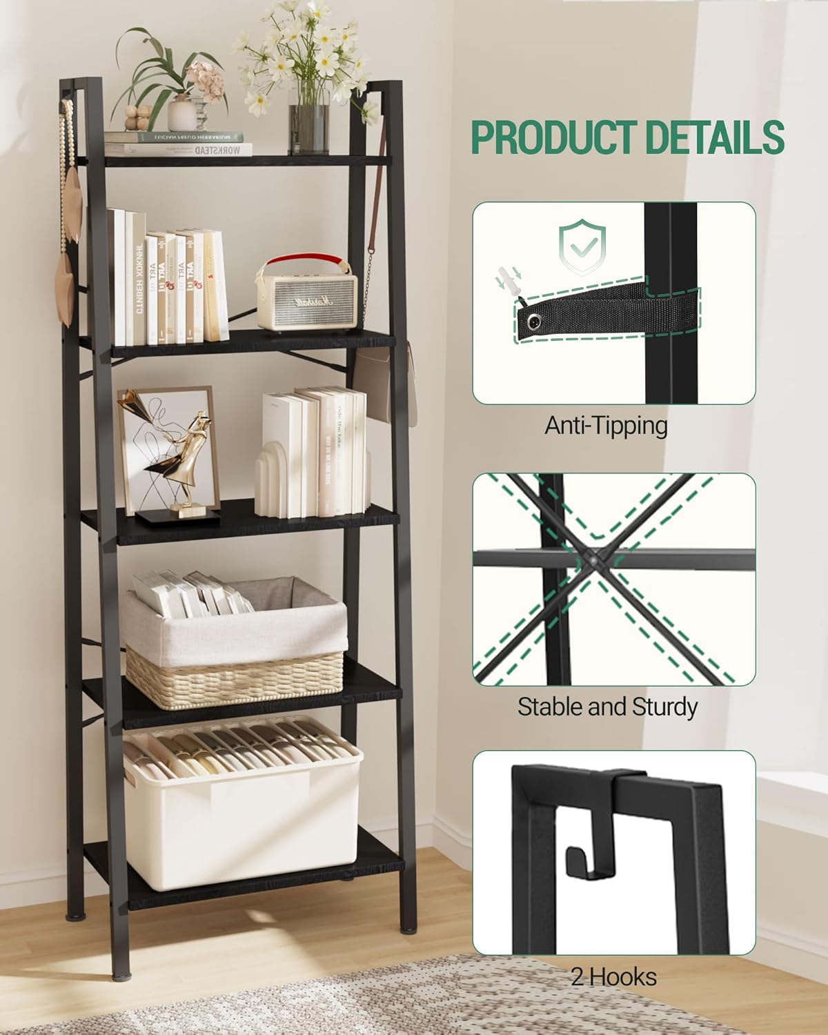 Ladder Shelf, Bookshelf Bookcase, Freestanding Corner Storage Shelve with 2 Hooks for Home Office, Living Room, Kitchen, Bedroom, Industrial, 5-Tier Black BC19304B