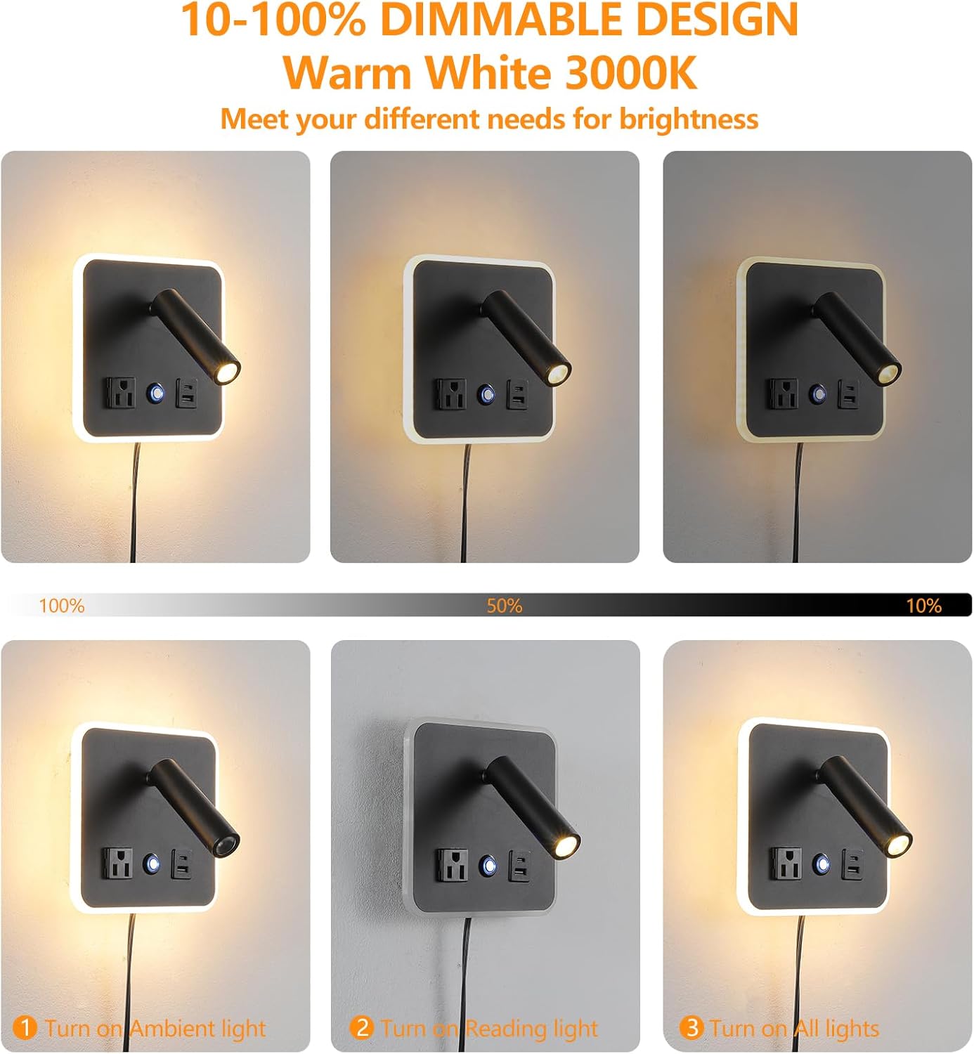LED Wall Mounted Lamp and Reading Light 2-in-1 Multifunctional Wall Sconces. LED Wall Lamp Plug in for Bedroom Bedside Wall Sconces Reading Light 3W+6W Night Light 3000K (Black)