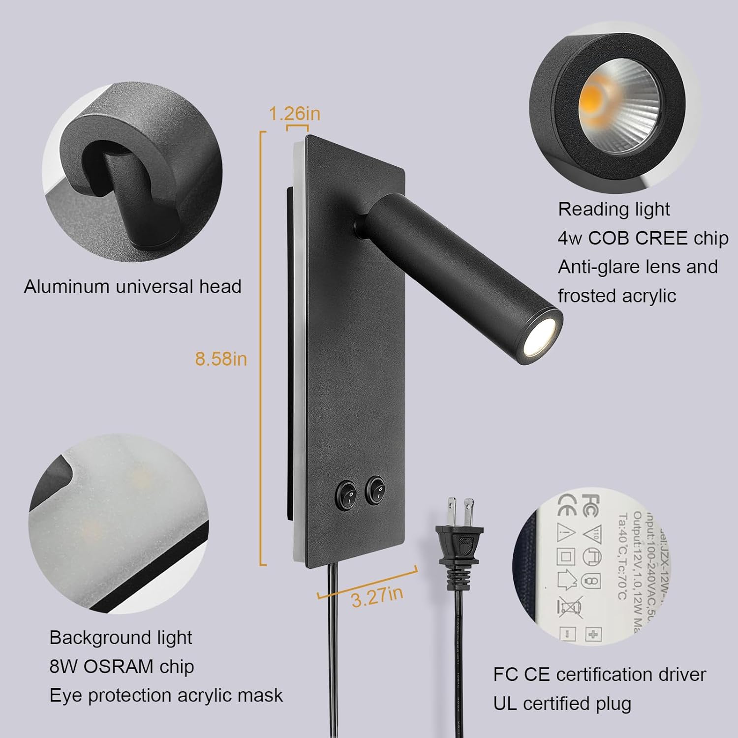 Bedhead wall lamp description: 8.58 “high x 3.27” wide x 1.26 “deep, plug wire length: 43.3” simple and modern design. The reading lamp installed on the wall is equipped with a 43.3 “plug wire that can be plugged into a wall power outlet. It can also be hard wired, and all installation hardware is included in the package. Both options can be installed horizontally or vertically.