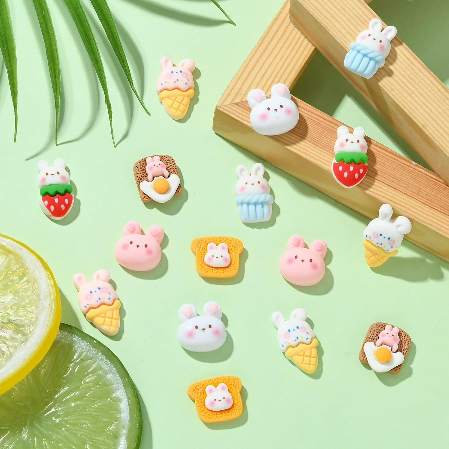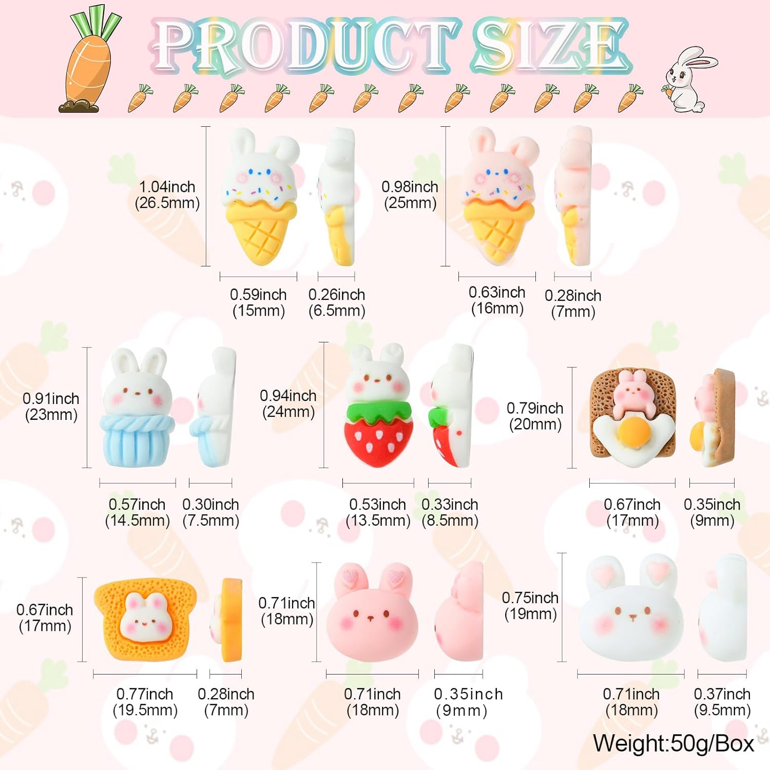 🐰Package: You can get a total of 40 Pcs rabbit with food cabochons with 8 different styles for DIY selection. The cabochons will be placed in a plastic box for easy storage.