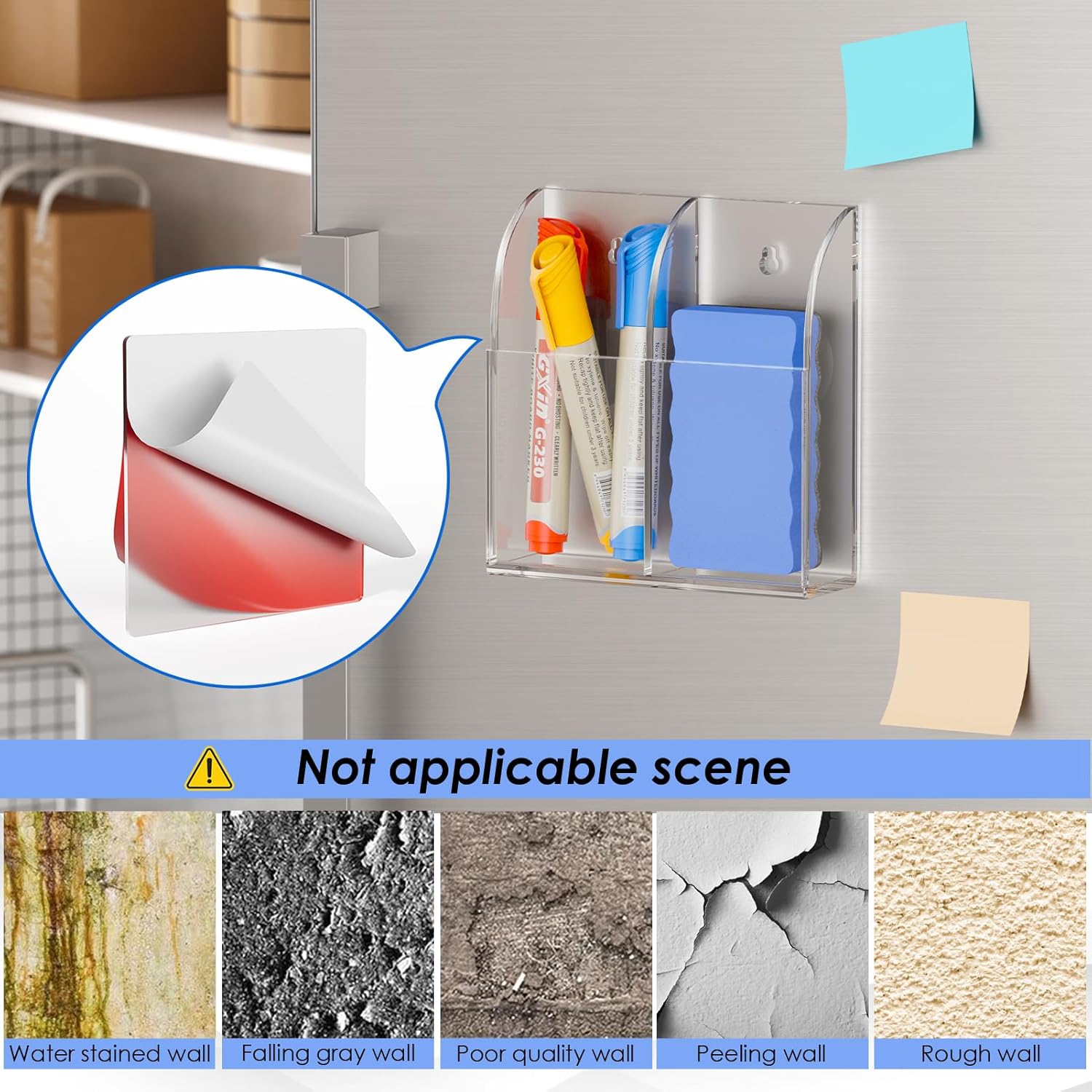 Tear the tape’s cover, and adhere one side on the back surface of this marker holder, and the other on the wall or the whiteboard, then organize your markers and eraser efficiently.