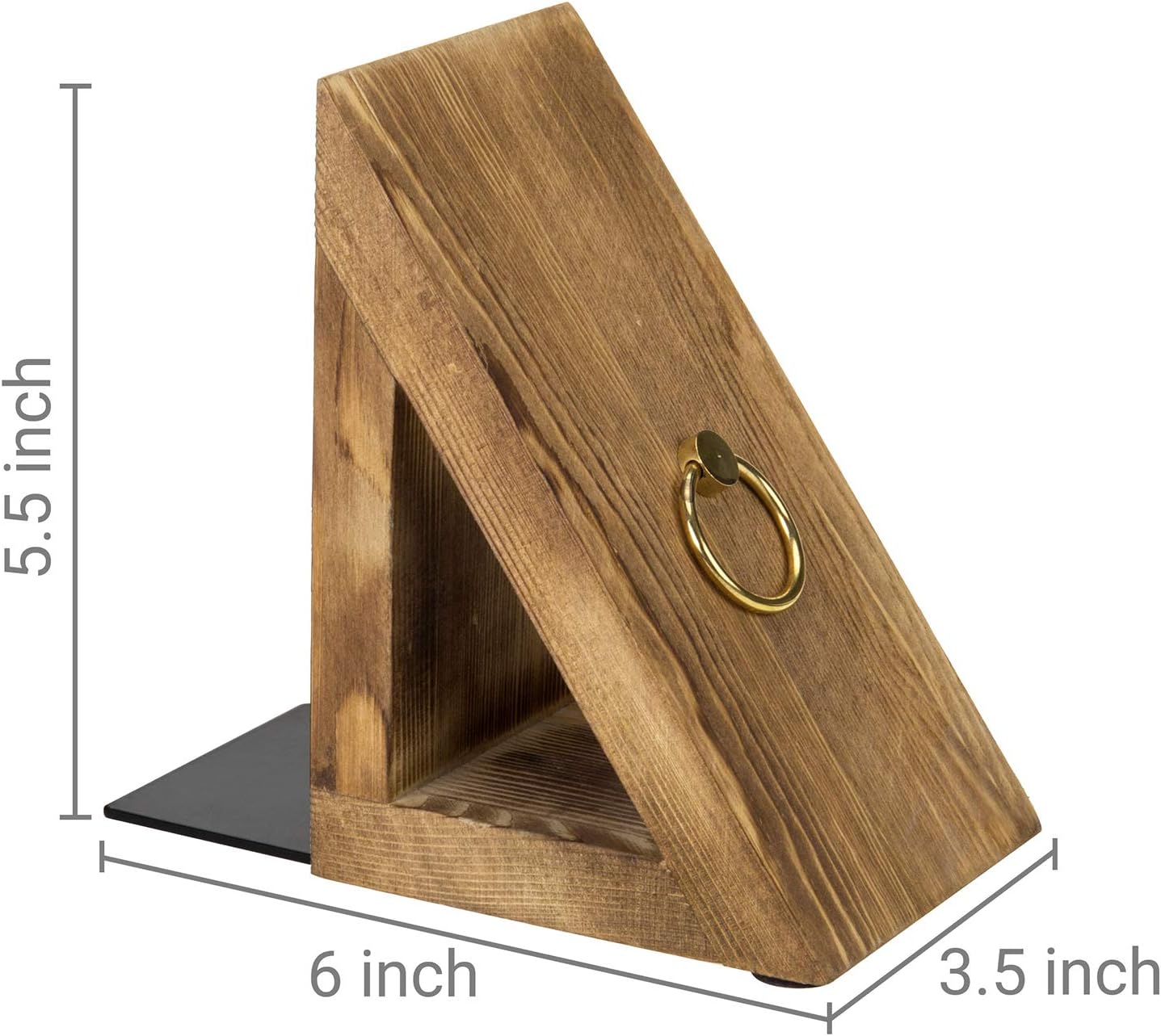 MyGift Rustic Burnt Wood Decorative Bookends with Triangular Design, Office Desk Wooden Bookend Book Stand with Brass Tone Ring Accent, 1 Pair