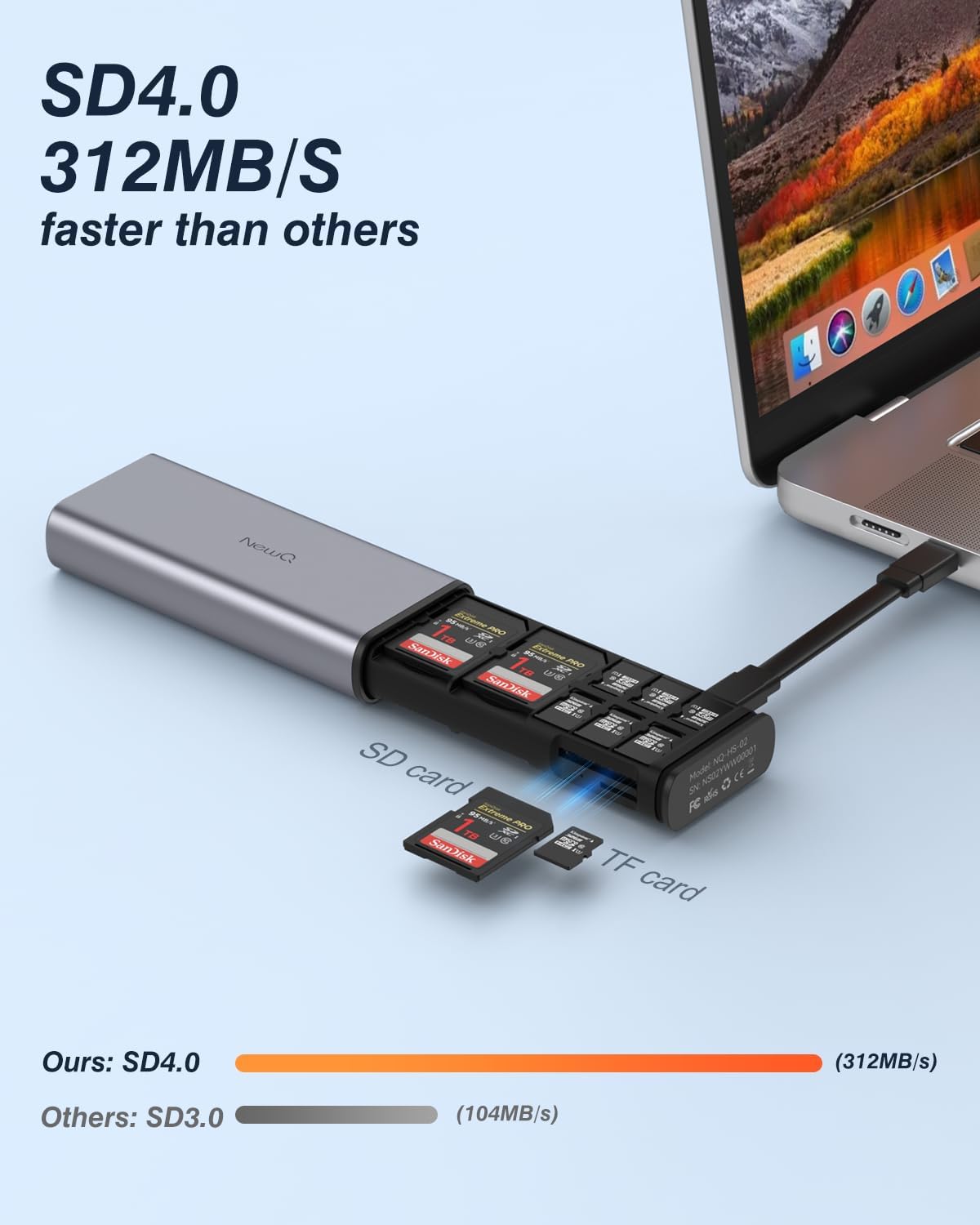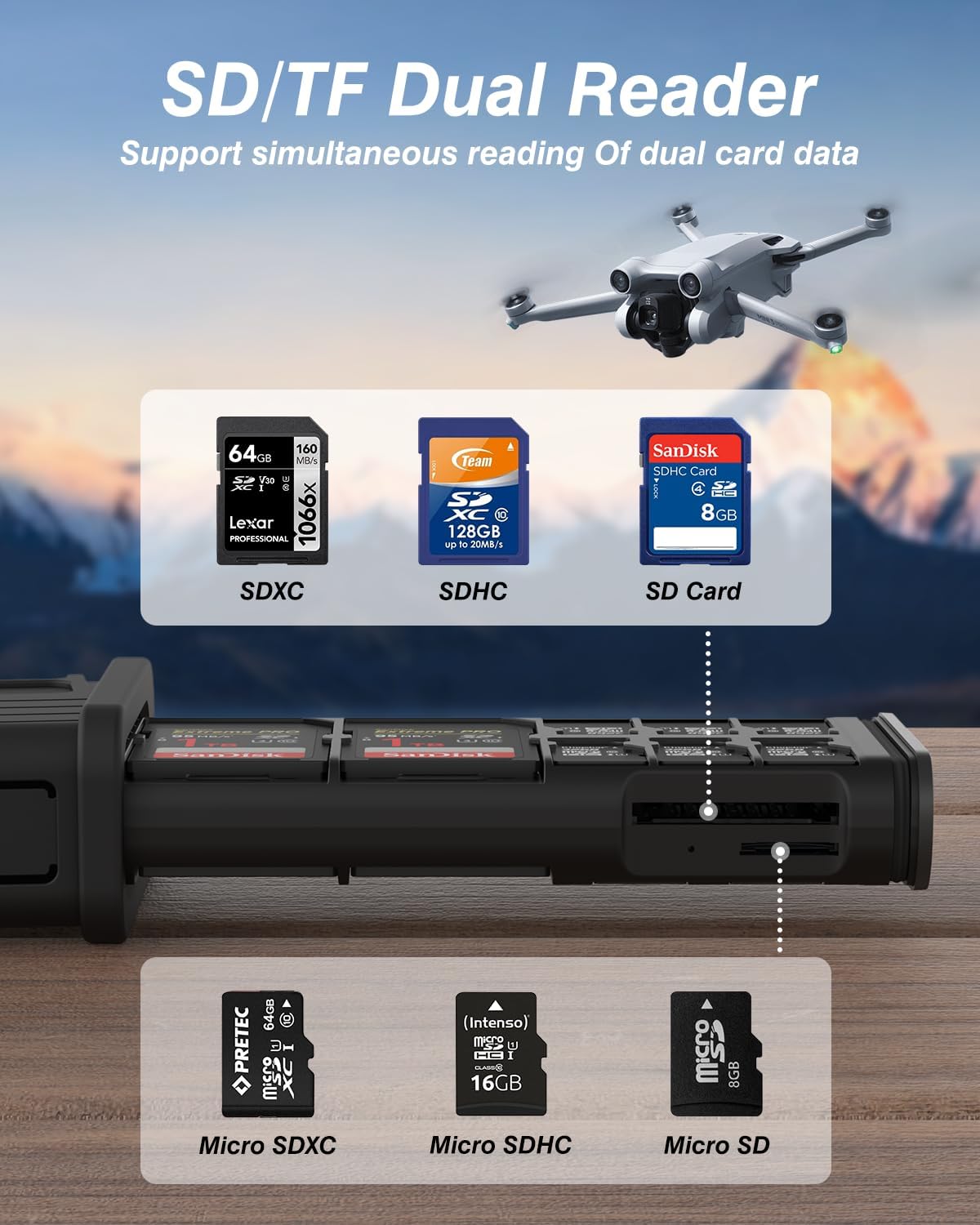 Broad Compatibility: Devices: cameras, drones, action cameras, laptops, desktop computers. Widely supports different kinds of memory cards, such as UHS-Ⅱ, SD 4.0: UHS-Ⅱ SDXC/SDHC/SD cards, UHS-ⅠSDXC/SDHC/SD cards, UHS-Ⅱ micro SDXC/micro SDHC/micro SD cards, UHS-Ⅰ micro SDXC/micro SDHC/micro SD cards, compatible with Windows 7 and above, Mac OS 10 and above, Linux, Android, iPad OS.