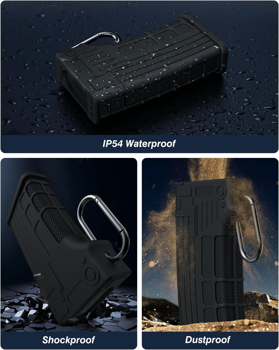 Careful Design: Made of aluminum alloy, and come with a Silicone case to provide fall and shock protection. Carabiner clip allows easy carry. Built-in sealing ring which can reach IP54 waterproof level for dust and splash resistance.And Easily removes and organizes Type-C cables with two small slot design.