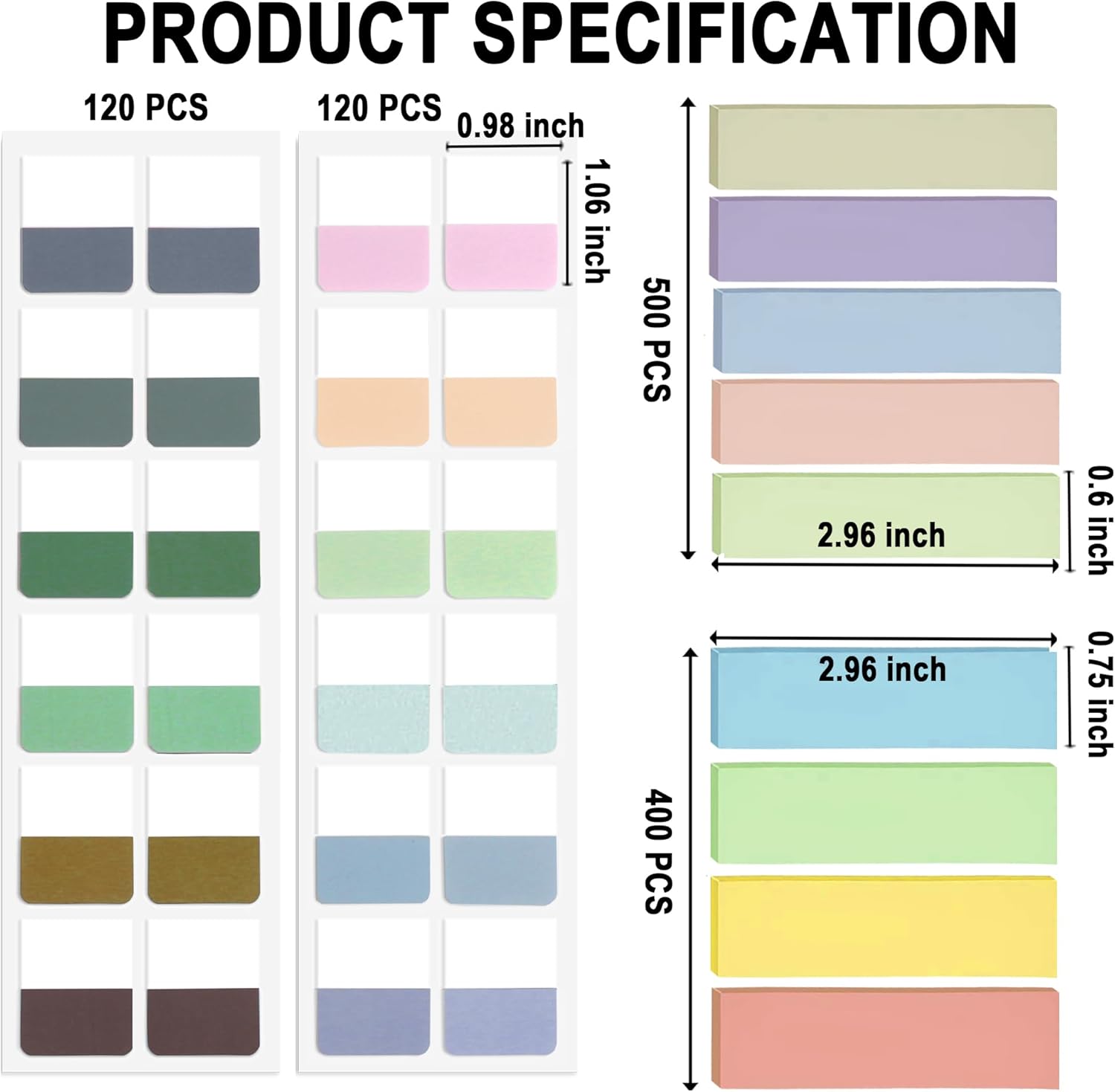 Tabs & Notes : These sticky tabs comes in two styles, long note and square note. The strips tabs come in 9 colors with 100 pieces each . Medium note 12 colors, each color 20PCS,1140pcs tabs in total.