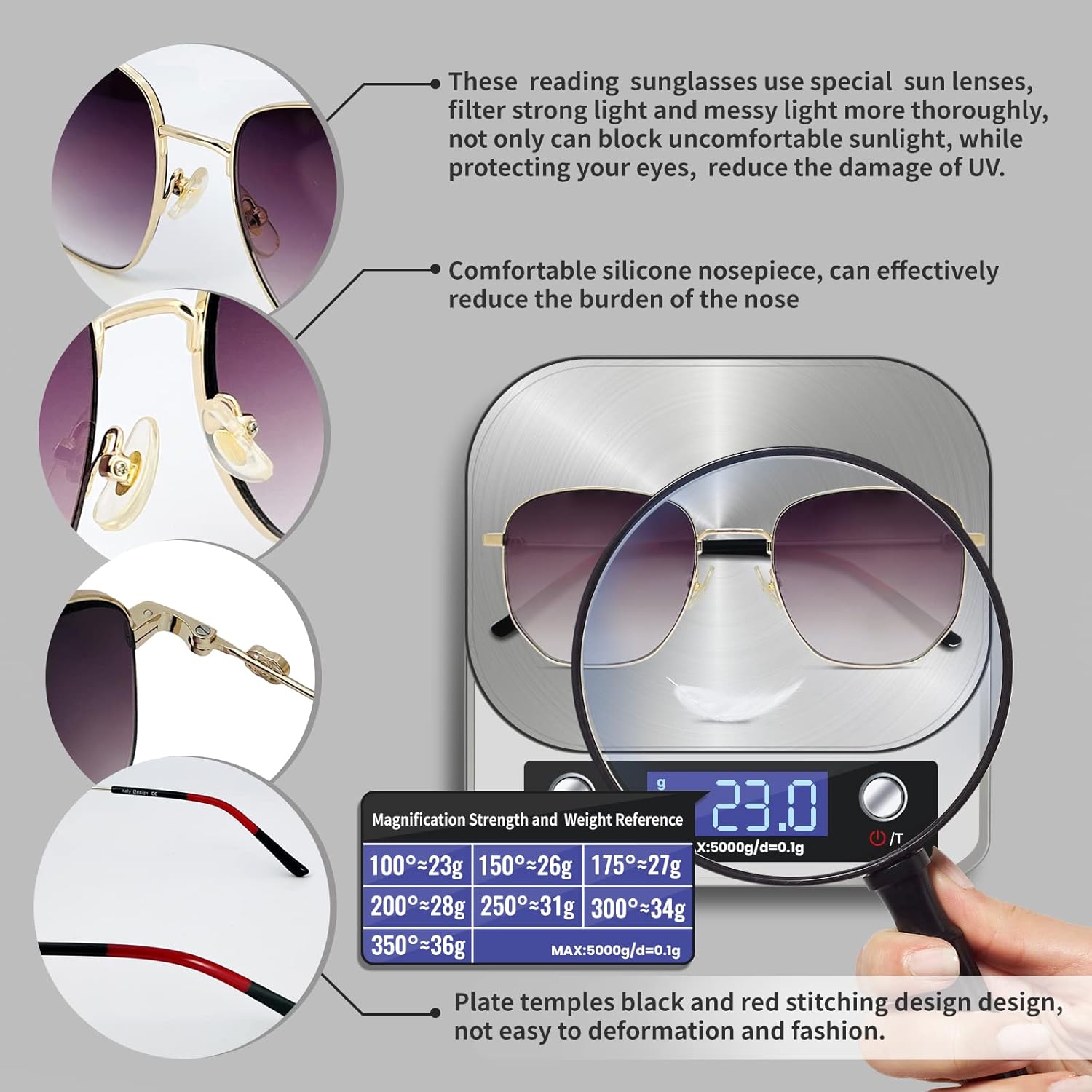 🤞【Excellent Design & More Comfortable】-These tinted reading glasses are made of metal frame, flexible temples, automatic width adjustment, comfortable to wear; comfortable silicone nosepiece, can effectively reduce the burden of the nose; reinforced hinge design, durable; plate temples design, not easy to deformation; double round decorative embellishment design, better fashion.