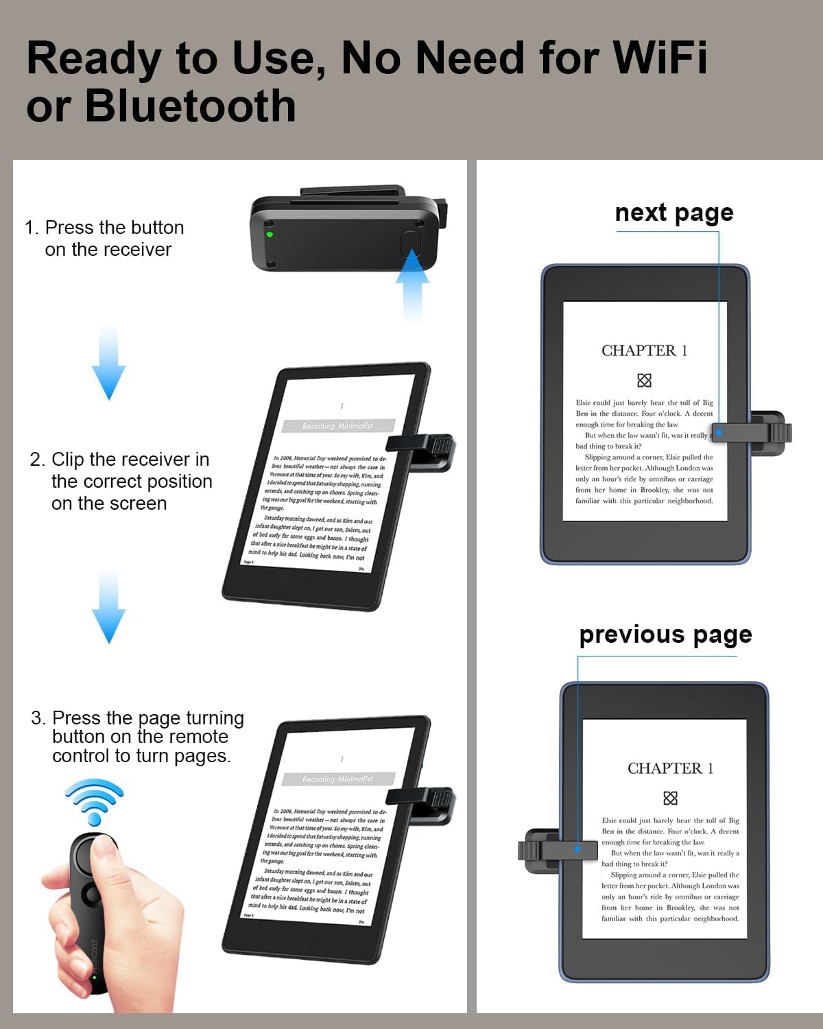 Page Turner for Kindle: Helps release your hands and make reading more easier. No need to touch the screen, you can lie comfortably to remote control the page forward. This page turner is a remote control that is attached to the side of any e-reader or iPad/Tablets. It is used to turn the pages for eBooks with a click of a button.