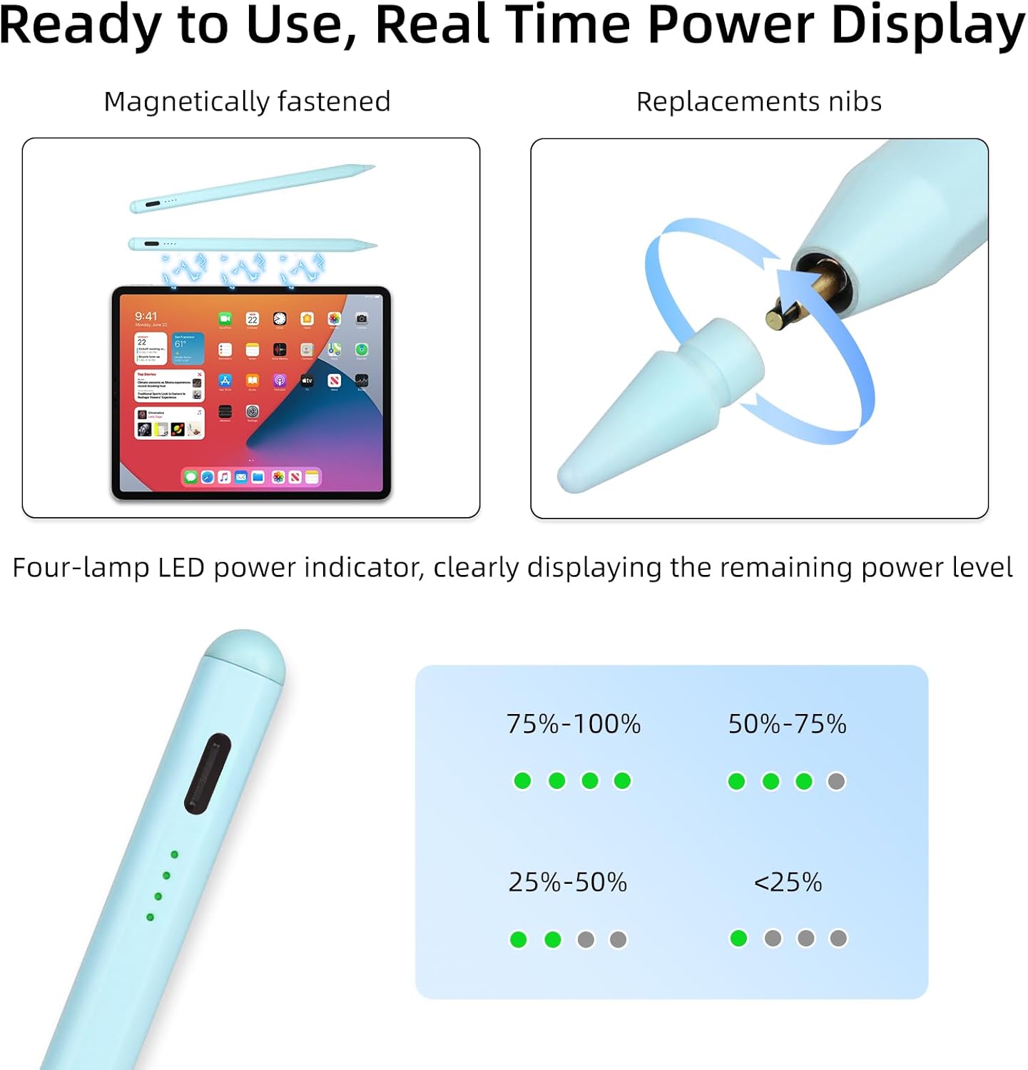 Upgraded – Indicator power display: The stylus displays four levels of power. The power indicator lets you know in real time how much power is in the stylus, so you can protect your work process and recharge the stylus when the power is about to run out. Charging takes about 20 minutes and provides 10 hours of continuous use. To conserve power, it automatically shuts off after 10 minutes of inactivity.