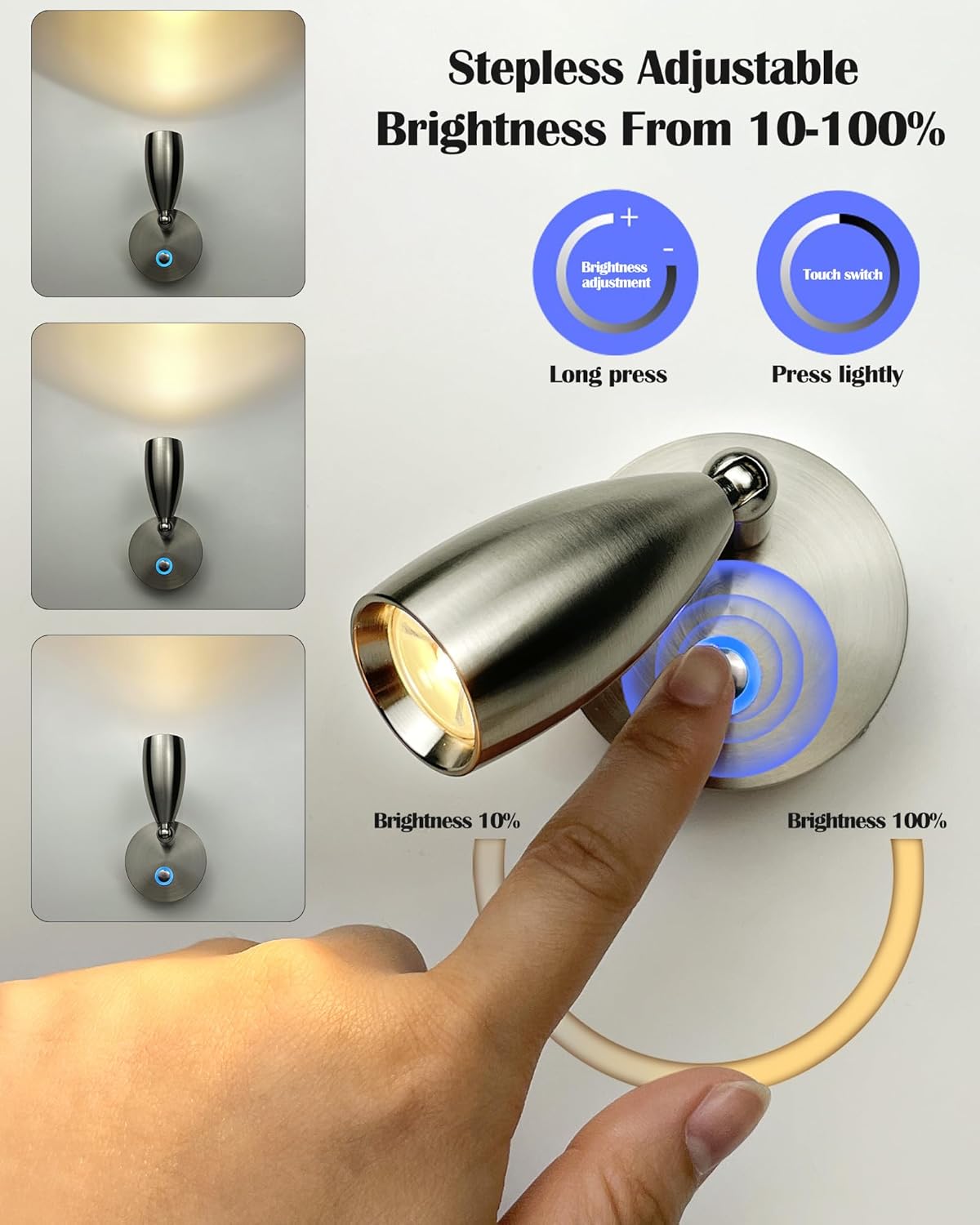 The brushed nickel reading light has a round touch switch on the base that emits a blue non-glare light when turned on, so you can use it as a night light at night. The round switch is step-less dimmable.