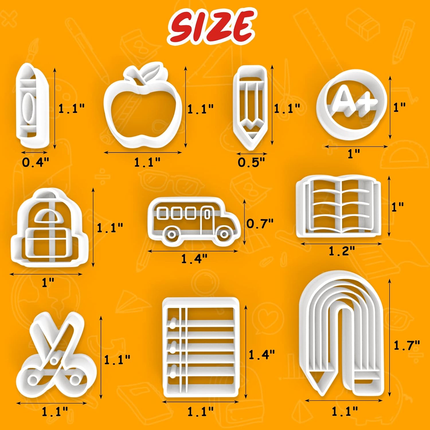 School Polymer Clay Cutters: Package comes with 10 pieces of clay cutters of in various back to school styles: apple, pencil, crayon, book, notebook, school bus, backpack, and so on. Specially designed for polymer clay earrings and jewelry making. A variety of styles and a sufficient amount may fully meet your daily DIY needs