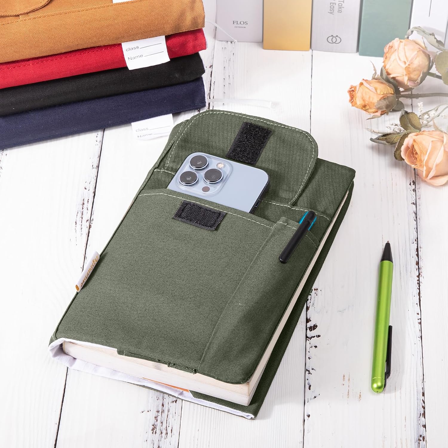 đź•®FUNCTIONAL POCKETS – This fabric book cover features a convenient pen slot and 2 pockets for the phone, card, iPad, and key.