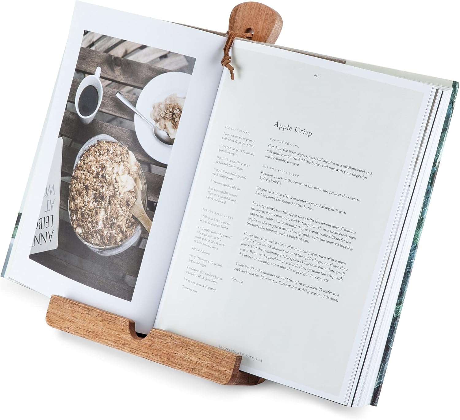 MADE FROM NATURAL ACACIA WOOD – Constructed from smooth acacia wood, this cutting board book stand shows off the natural wood grain making it as beautiful as it is useful. The wooden ledge that keeps cookbooks open makes it extra functional.