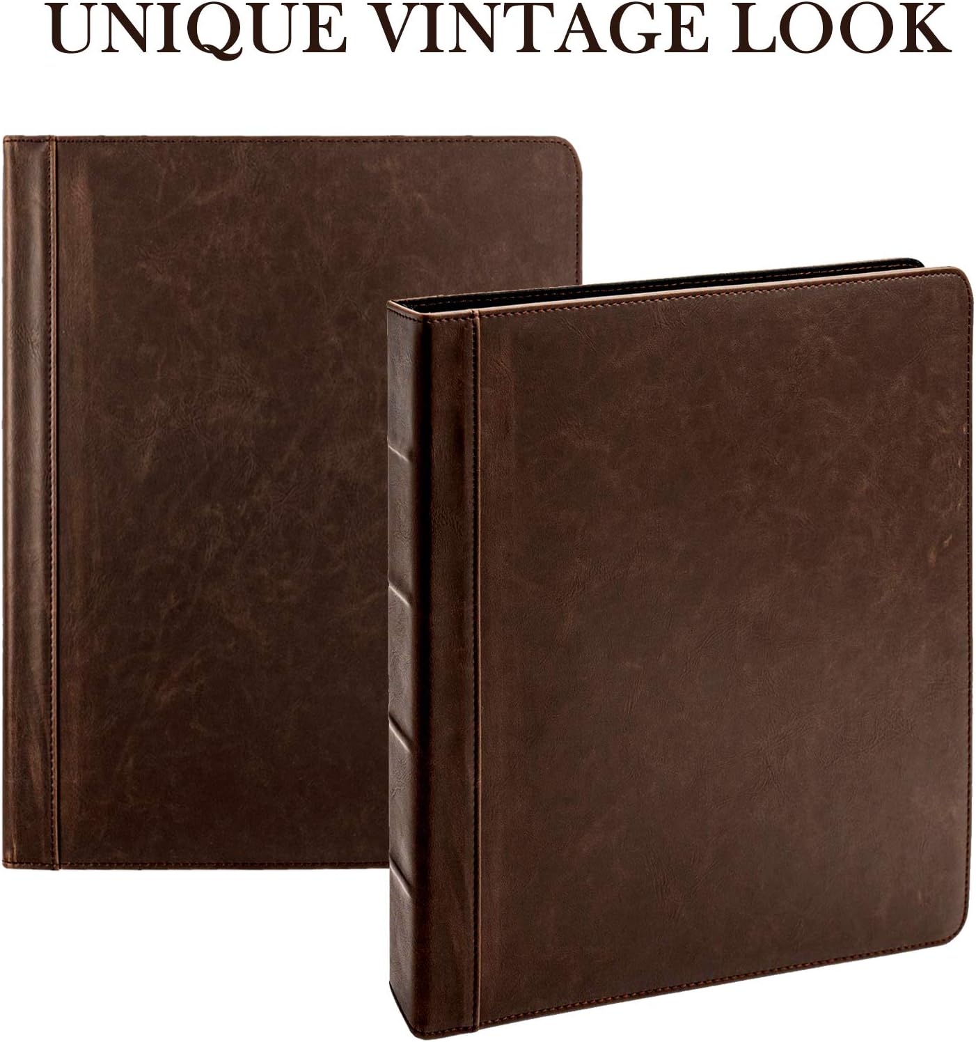 Stylish antique look – Professional looking binder to organize your 8.5″ x 11″ papers and sheet protectors. Designed to look like vintage brown leather. With this vintage hardback book style, you will be perceived as a fashion forward professional. The elegant look and feel of dark brown aged leather together with the stunning book-like spine combines simplicity and sophistication with a hint of unique antique appeal. Looks great in your home or office.