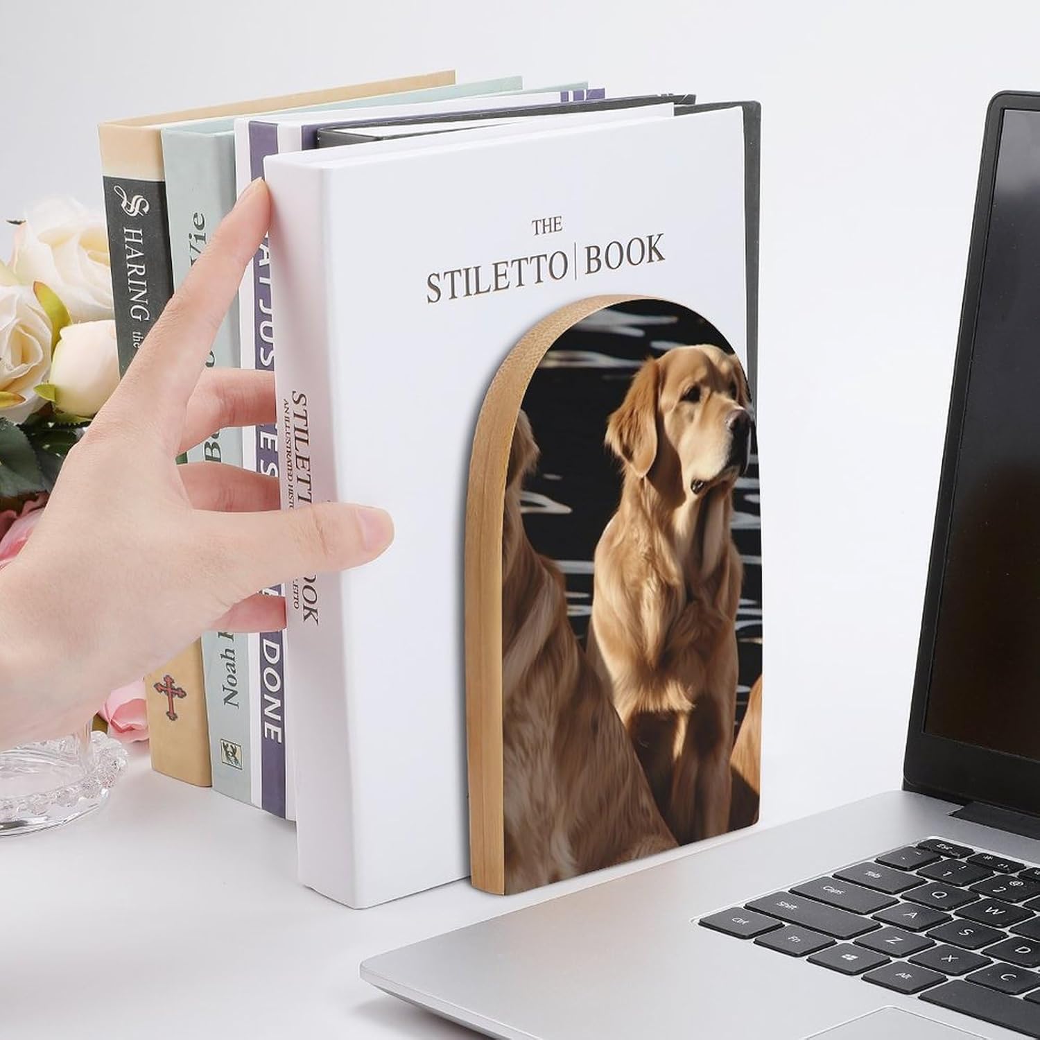 Wood Bookends Decorative Bookshelf Golden Retrievers Heavy Duty Wooden Book Shelf Decorate Bookshelves Book Stopper Book Holders Desk Accessories