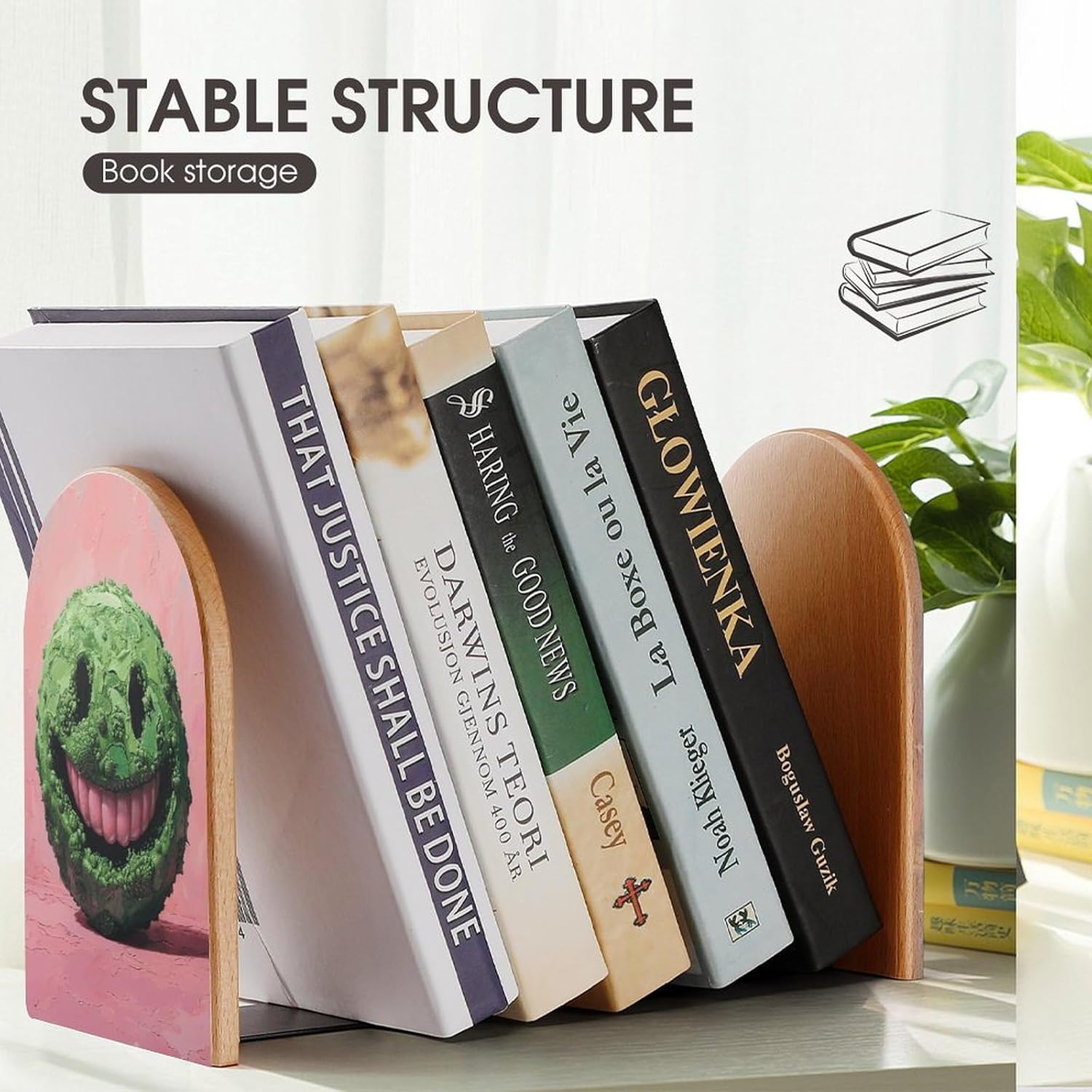 This bookend is made of beech wood, the base is made of metal, and the bookshelf has a thick structure.