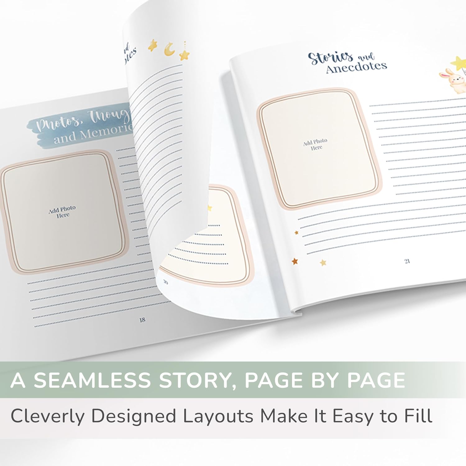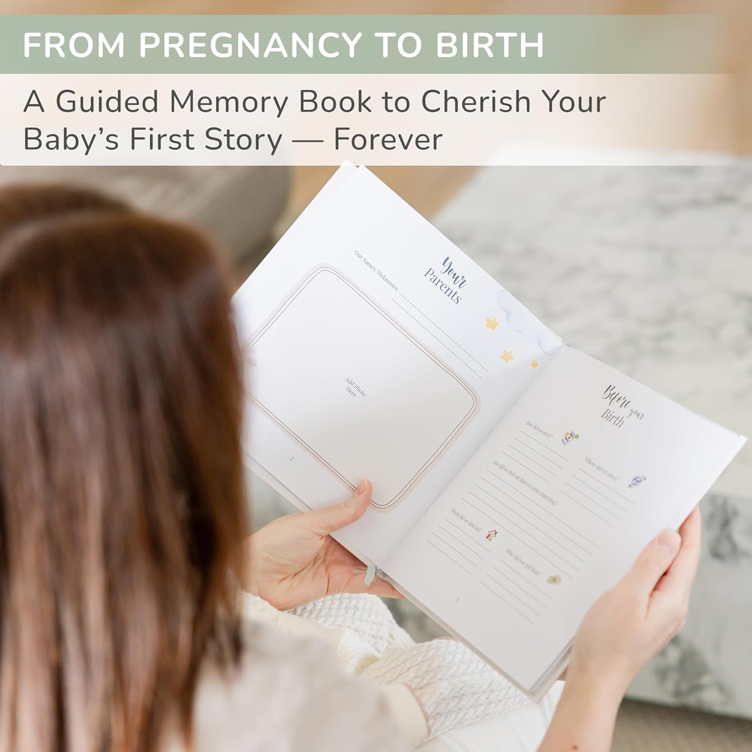 CAPTURE AND TREASURE MOMENTS AND THOUGHTS: Dedicated sections spanning from pregnancy to the first birthday allow you to craft enduring memories. Our baby memory book boasts 50 high-quality pages, a sturdy hardcover adorned with exquisite gold embossing, and enchanting hand-drawn illustrations. Document your emotions, reflections, and experiences, relishing the joy of revisiting them in the years ahead.